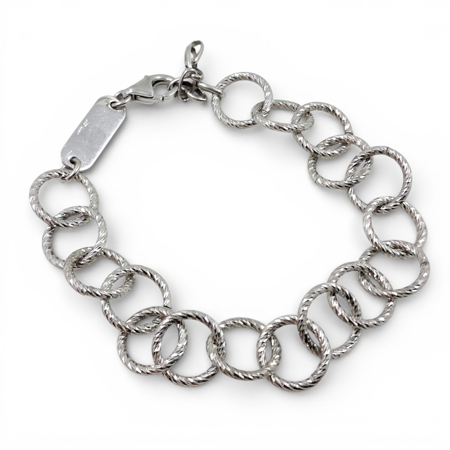Questo bracciale in argento ad anelli diamantati valorizza il proprio stile con un accessorio che cattura ogni raggio di luce. La particolare lavorazione sulla superficie del metallo crea una serie di sfaccettature brillanti molto simili a piccoli diamanti incastonati. La struttura si compone di una catena fluida ed elegante. Ogni maglia circolare riflette bagliori argentati ad ogni minimo movimento del vostro polso. [SPLIT] La leggerezza estrema di questo bracciale in argento è molto apprezzata durante tutto l’arco della giornata. La pratica chiusura con moschettone permette di indossare il gioiello con grande semplicità e sicurezza. Molte donne scelgono il bracciale in argento ad anelli diamantati per completare un look formale o per illuminare una serata speciale.